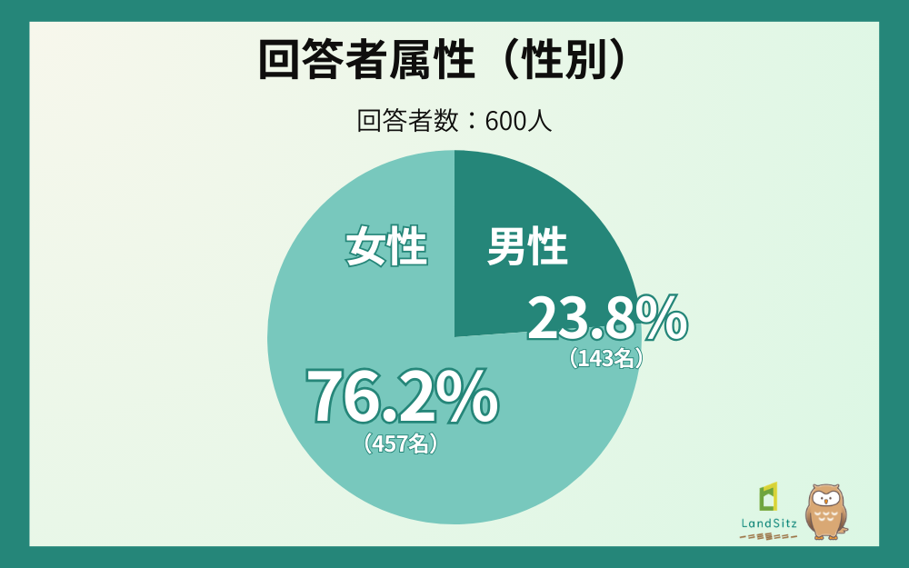 今回の調査では、女性が76.17%(457名)、男性が23.83%(143名)という構成となりました。マイホームに関する情報収集や関心度の高さが、女性回答者の多さに表れていると考えられます。
