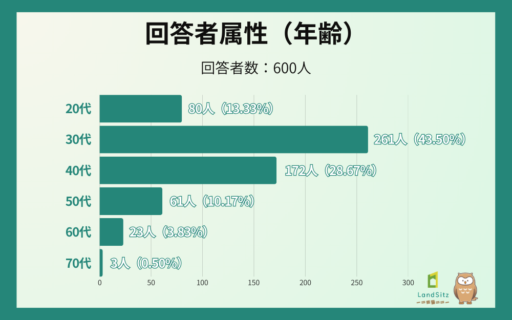 年代別では、30代が最多で43.50%(261名)、次いで40代が28.67%(172名)、20代が13.33%(80名)と続き、住宅購入を現実的に検討しやすいライフステージの方が全体の約8割を占める結果となりました。