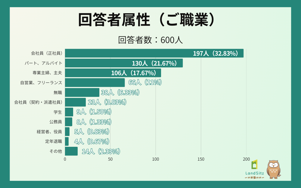 職業別では、会社員(正社員)が32.83%(197名)で最多、次いでパート・アルバイトが21.67%(130名)、専業主婦・主夫が17.67%(106名)と続きました。