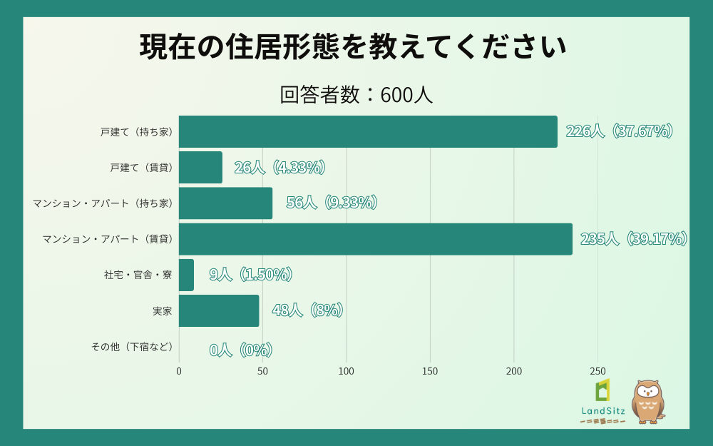 戸建て(持ち家):37.67%(226名)