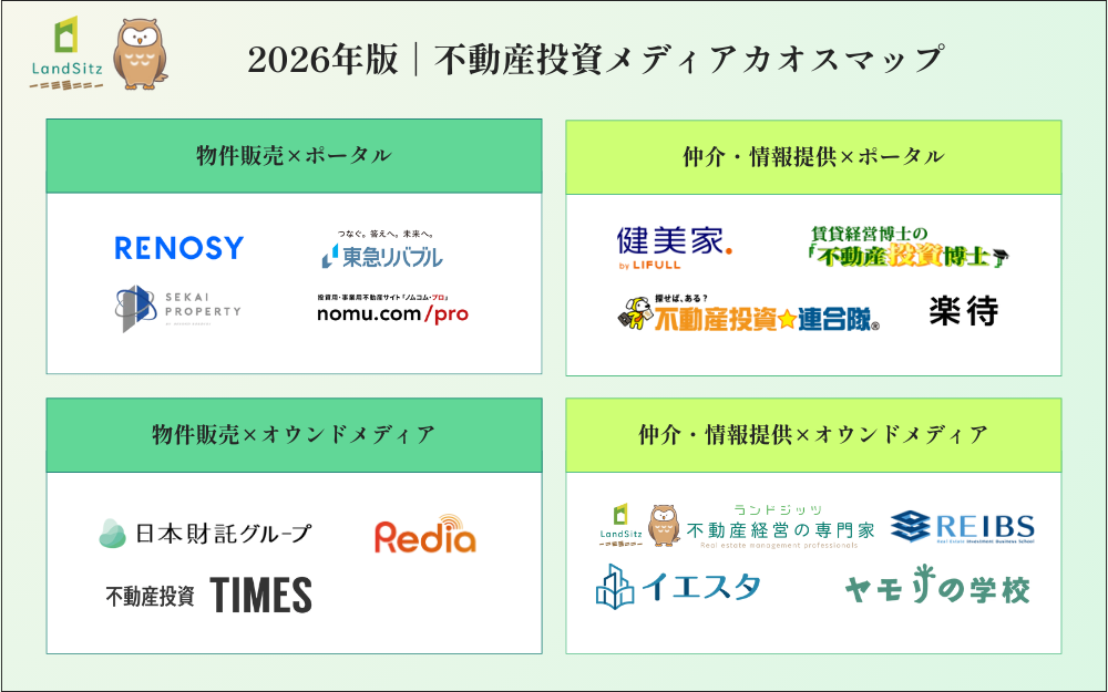 不動産投資に関する情報を発信するオウンドメディア「不動産投資の裏側を知る教科書」(運営:株式会社LandSitz、https://landsitz.biz/)は、不動産投資業界の全体像を把握しやすくするため、「2026年版|1棟不動産投資会社カオスマップ」と「2026年版|不動産投資メディアカオスマップ」の2種類を作成し、公開いたしました。